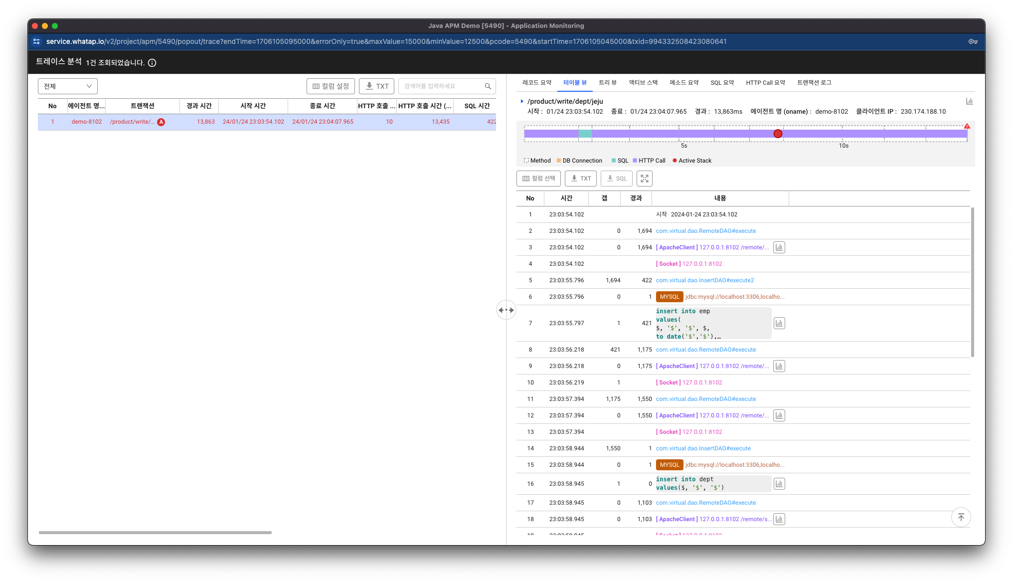 와탭 로그모니터링의 주요 어필 포인트 중 하나가 APM의 트랜잭션 정보와 해당 트랜잭션동안 발생한 로그 정보를 하나의 흐름으로 묶어서 조회하는 기능입니다. 가끔 신규 고객사분들 중에서 POC 과정에서 트랜잭션 로그 기능만 보시고 바로 계약하자고 하시는 분들이 있으실정도로 중요하고 핵심적인 기능입니다.