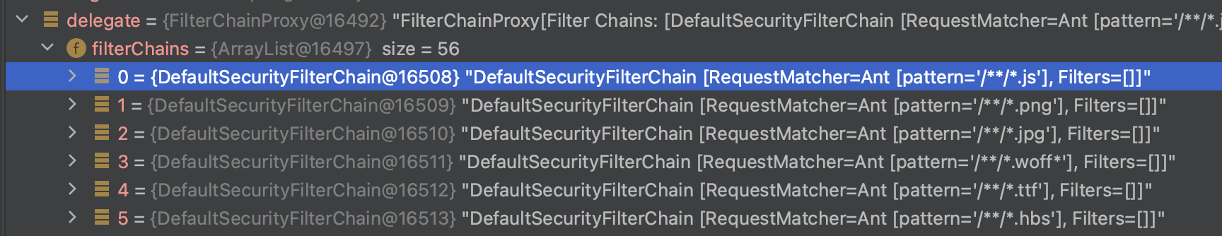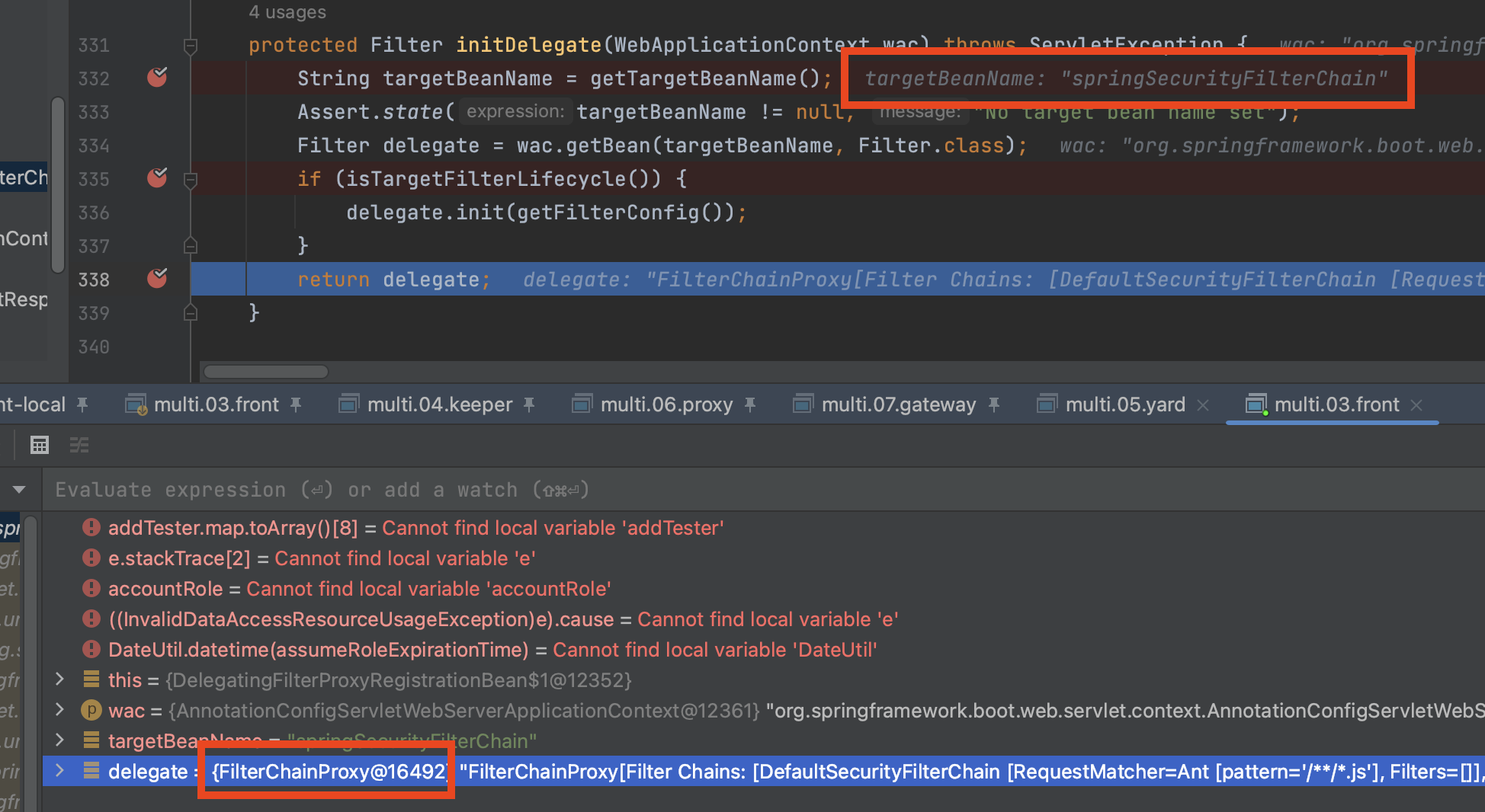 - 조회된 delegate는 FilterChainProxy 타입의 객체가 할당되었다.