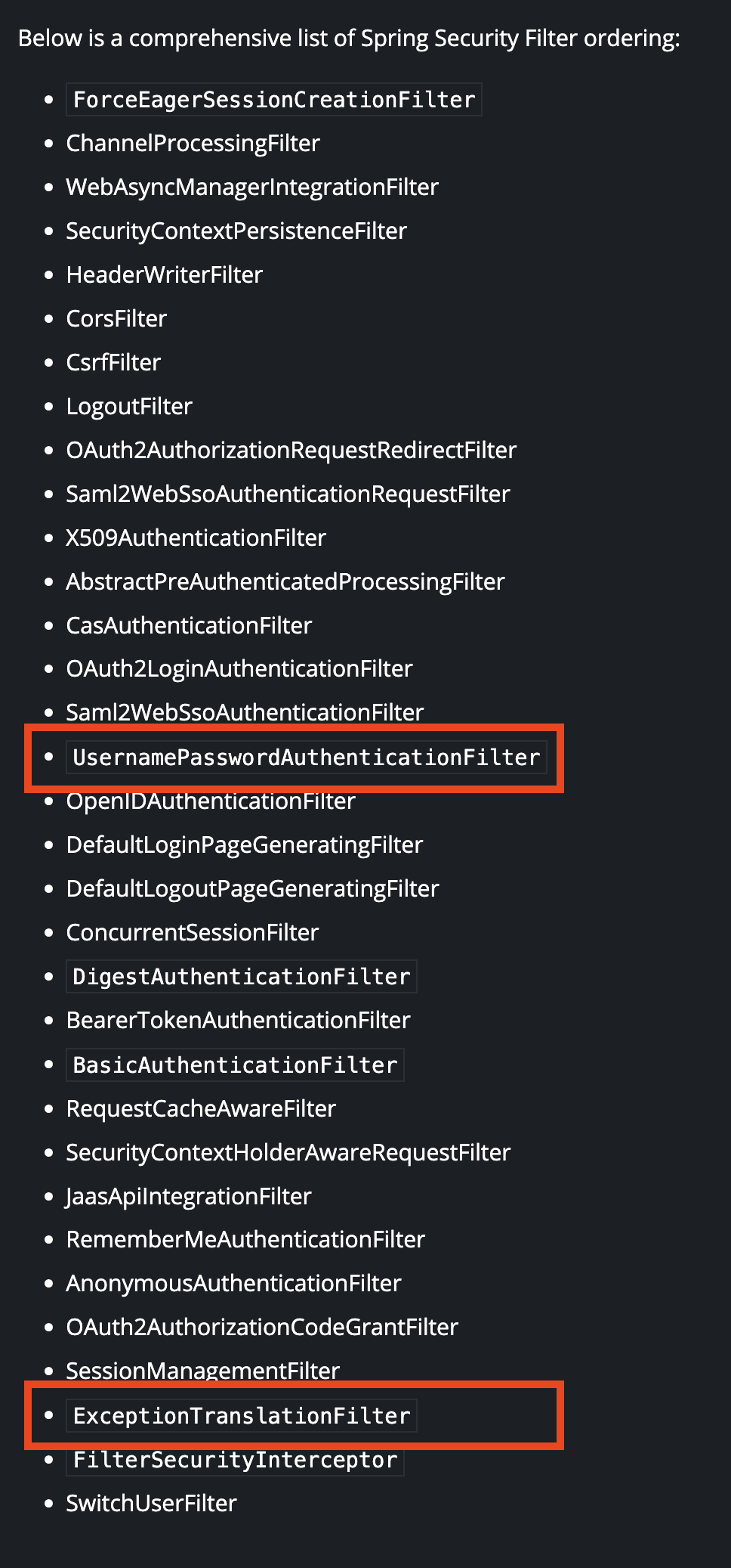 SecurityFilterChain에 포함되는 SecurityFilter의 목록입니다. 사용자의 인증 과정은 대부분 UsernamePasswordAuthenticationFilter에서 일어납니다.