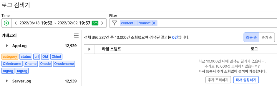 현재 데이터 조회 시간은 19시 52분 ~ 19시57분으로 5분입니다. 5분동안 396,287개의 로그가 수집이 되었습니다. 약 40만개의 로그 중에서 name이라는 키워드가 포함된 로그를 검색하고 싶습니다. 앞서 말씀드린 제약사항을 이유로 일정 갯수만큼 끊어서 조회하는 방식의 접근이 필요합니다. 위의 시안에서는 1만개씩 조회하고, 조회가 끝나면 그 다음 1만개를 조회할 수 있도록 설계된 방식입니다. '전체 396,287건 중 10,000건 조회했으며 검색된 결과는 0건'이라는 안내 문구를 통해서 '조회 시간 5분동안 수집된 로그에 대해서 첫 페이지(1만건)을 조회했다.' 라는 것을 알 수 있게됩니다.