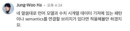 그런데 이러한 접근법에서 가장 어려운 부분은 “언어 모델과 수치 시계열 데이터 기저에 있는 패턴이나 semantics를 연결할 브리지”를 찾는 것입니다.