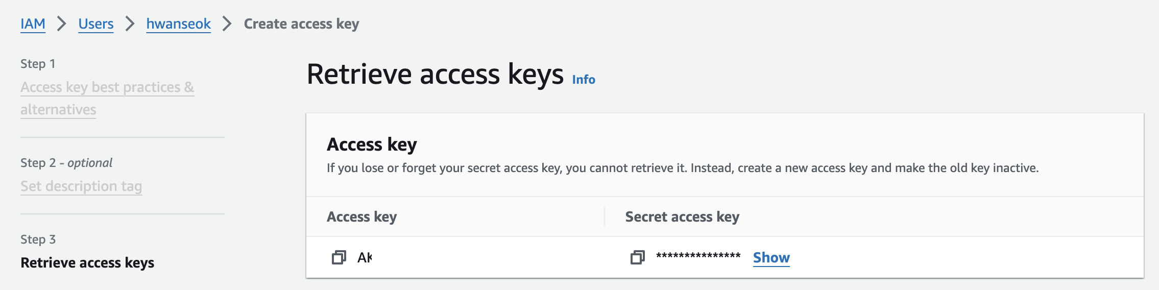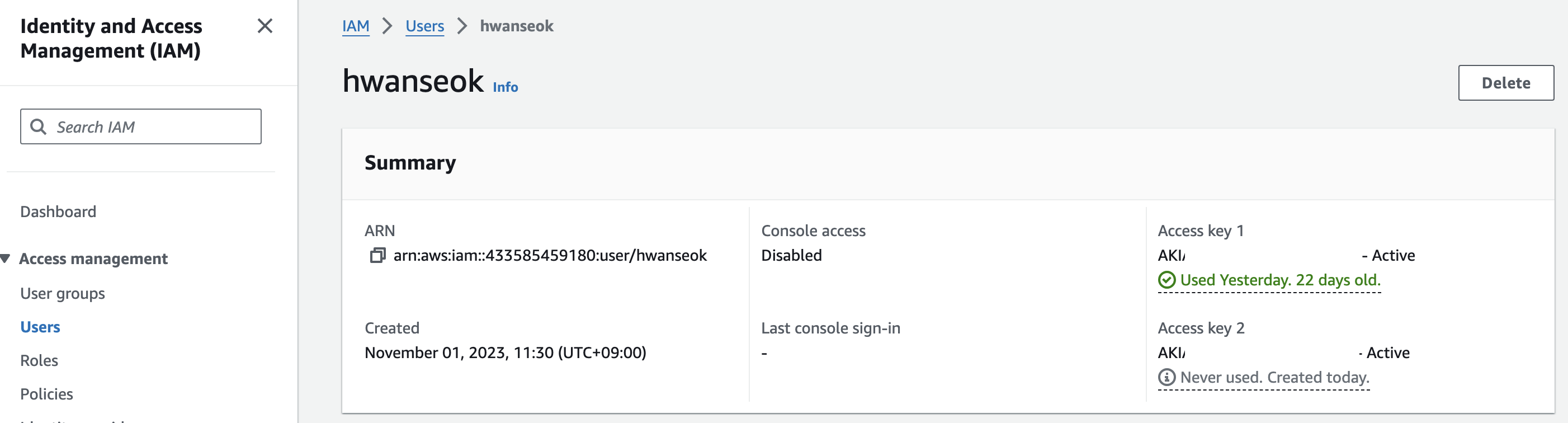 권한을 부여했으면 AccessKey, Secret AccessKey를 발급할 수 있습니다.