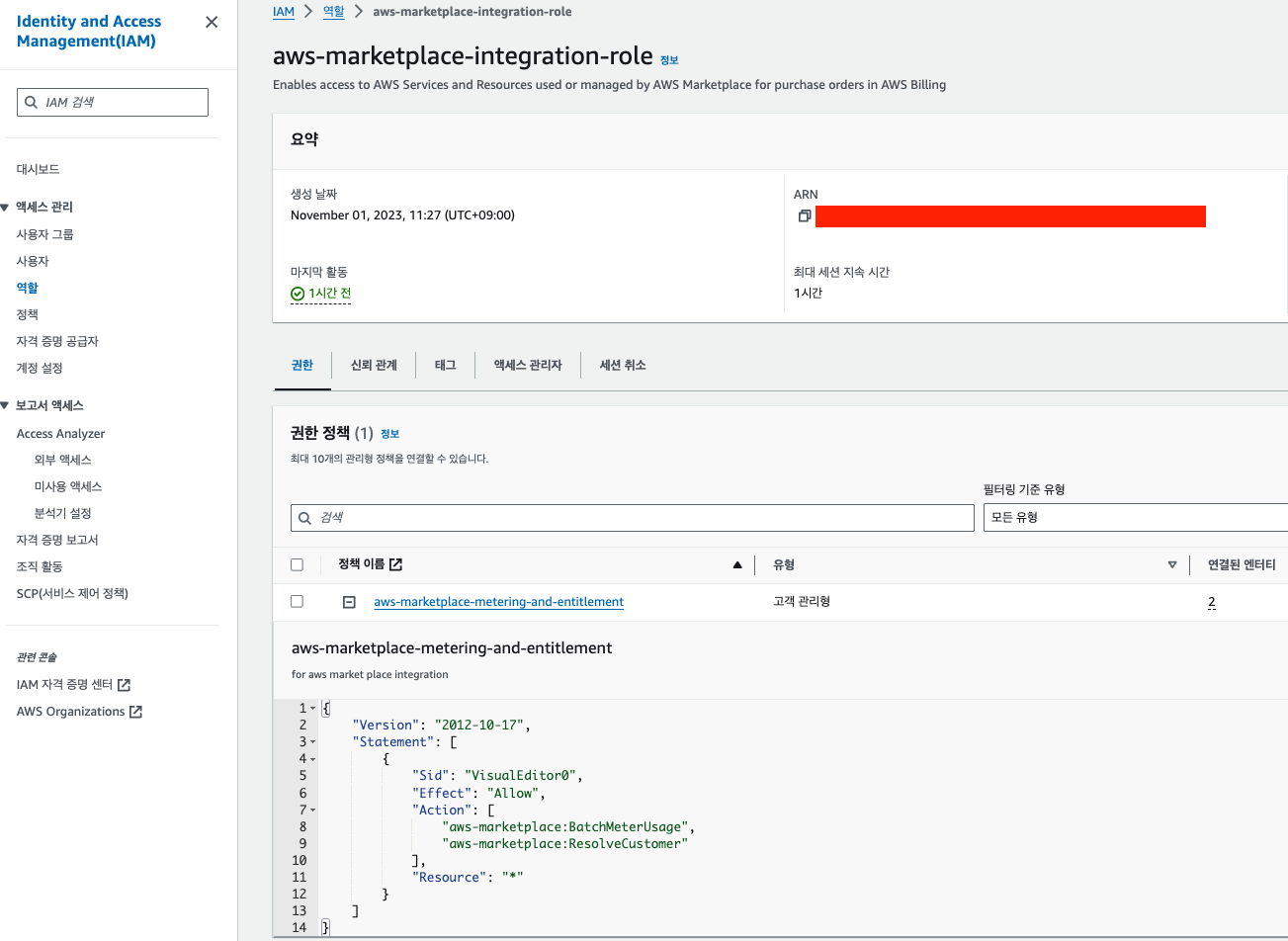 AWS Marketplace API에 필요한 정책을 추가한 Role ARN을 생성합니다.
